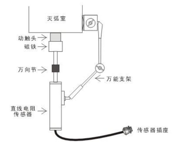 200mm、300mm用于SF6開關(guān)行程,速度的測量,此兩種傳感器為非標(biāo)準(zhǔn)配置。以某型號真空開關(guān)為例,如下圖。直線電阻傳感器在安裝時,要保證傳感器運(yùn)動軸能夠直線運(yùn)動,用磁性萬能支架固定好傳感器。對于SF6開關(guān)、油開關(guān),方法類似。