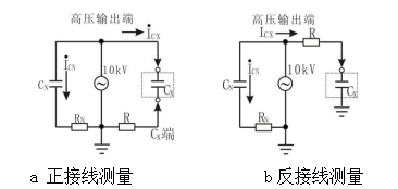 按被測試品是否接地分兩種測量方式,即正接線測量方式和反接線測量方式。兩種測量方式的原理如圖所示: