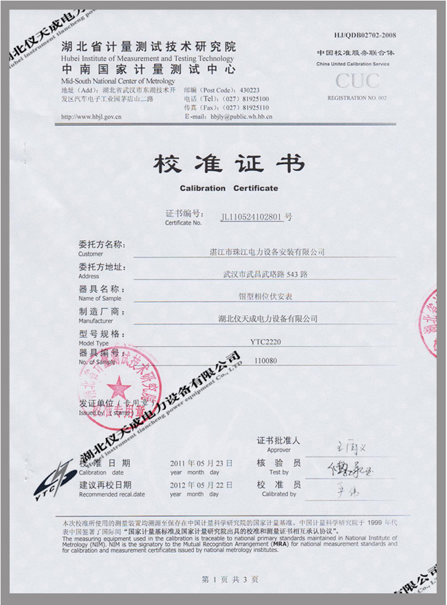 轉(zhuǎn)載:"YTC2220數(shù)字雙鉗相位伏安表鑒定證書" 請(qǐng)注明來(lái)源于儀天成電力。 更多技術(shù)問題請(qǐng)致電儀天成電力客戶服務(wù):027-87876585,技術(shù)部專線:027-87876585,在線客服: